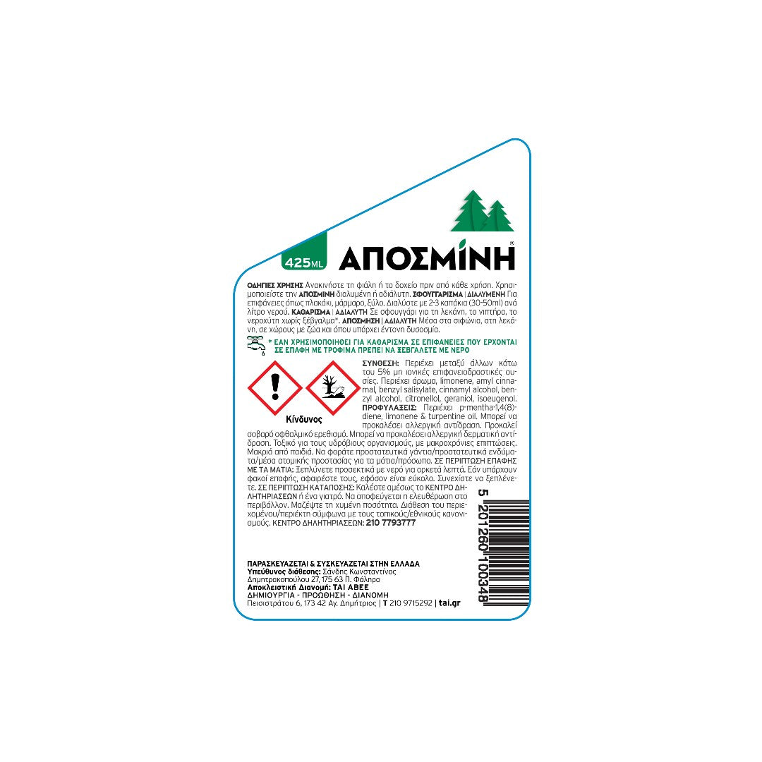 ΠεριγραφήΗ Αποσμίνη είναι υγρό αποσμητικό σκεύασμα. Χρησιμοποιείται στο σφουγγάρισμα, την λεκάνη, το νιπτήρα, το νεροχύτη, τα σιφώνια και όπου αλλού μπορεί να υπάρχει δυσοσμία. Αραιωμένο ή μη, αρκεί ελάχιστη ποσότητα ώστε να εξαφανίσει κάθε δυσοσμία και παράλληλα να αρωματίσει το χώρο, αφήνοντας ένα ευωδιαστό άρωμα πεύκου. Περιέχει μη ιονικούς γαλακτοματοποιητές και αρώματα, ενώ κατά το σφουγγάρισμα έχει και αντιστατική ιδιότητα.