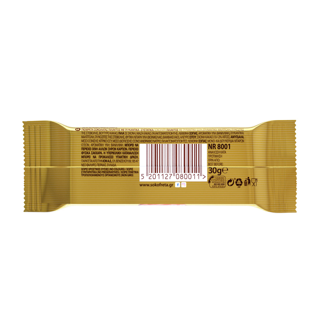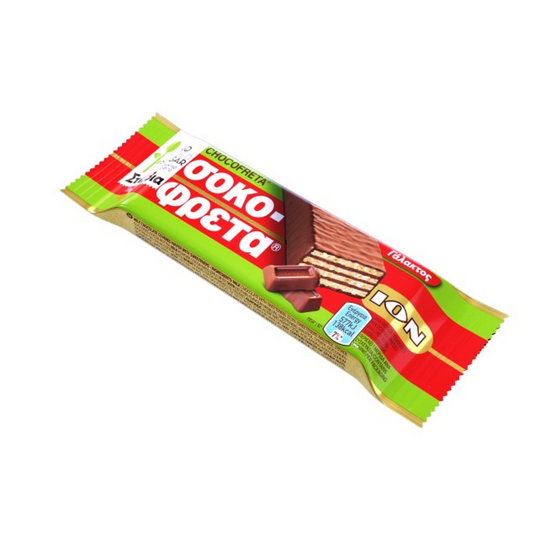 ΠεριγραφήΗ Σοκοφρέτα ΙΟΝ (38g) είναι μια τραγανή γκοφρέτα σοκολάτας γάλακτος και έχει ταυτιστεί στη συνείδηση του καταναλωτή με ολόκληρη την κατηγορία γκοφρετών. Απολαύστε την αγαπημένη σας σοκοφρέτα στην κλασική της χρυσοκόκκινη συσκευασία.