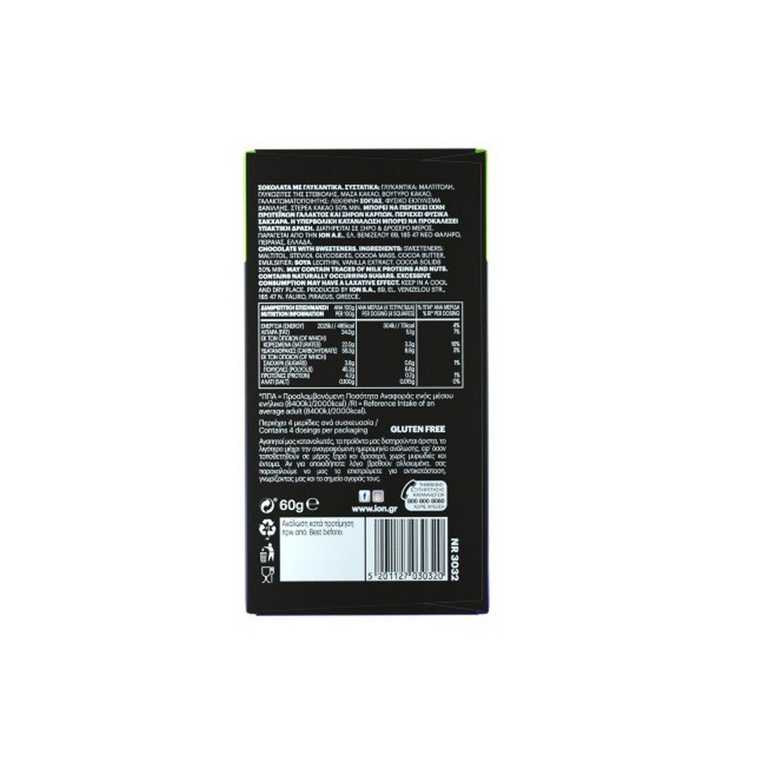 Περιγραφή Η ION DARK κλασική «Χωρίς προσθήκη ζάχαρης» αποτελείται από τη γνωστή και αγαπημένη γεύση, ION DARK κλασική, η οποία έχει δημιουργηθεί με φυσικά γλυκαντικά και στέβια.