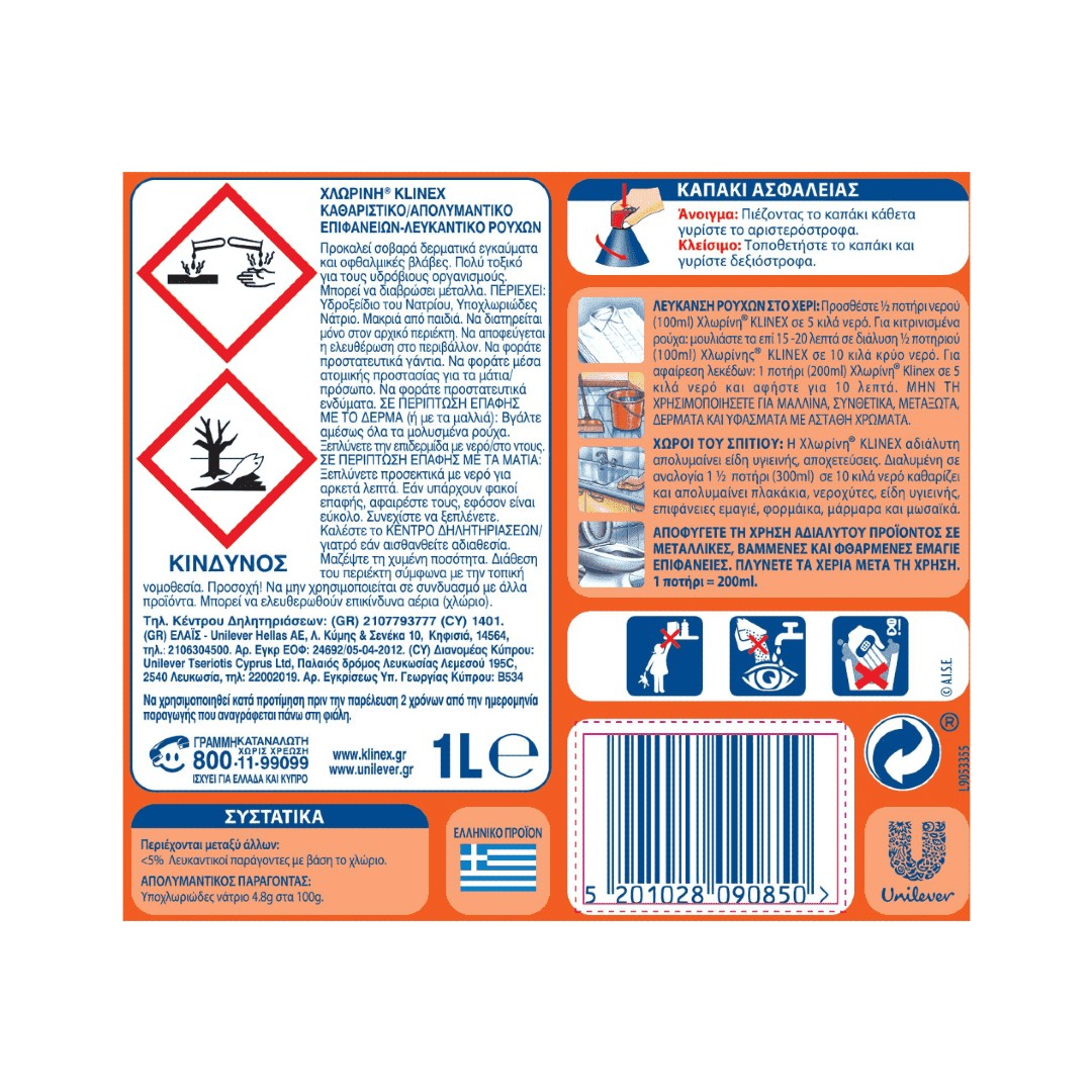 ΠεριγραφήΚαθαρίζει - Λευκαίνει - Απολυμαίνει. Η Λεπτόρρευστη Χλωρίνη® KLINEX είναι το ασφαλέστερο απολυμαντικό για γενική καθαριότητα και απολύμανση σε όλο το σπίτι.