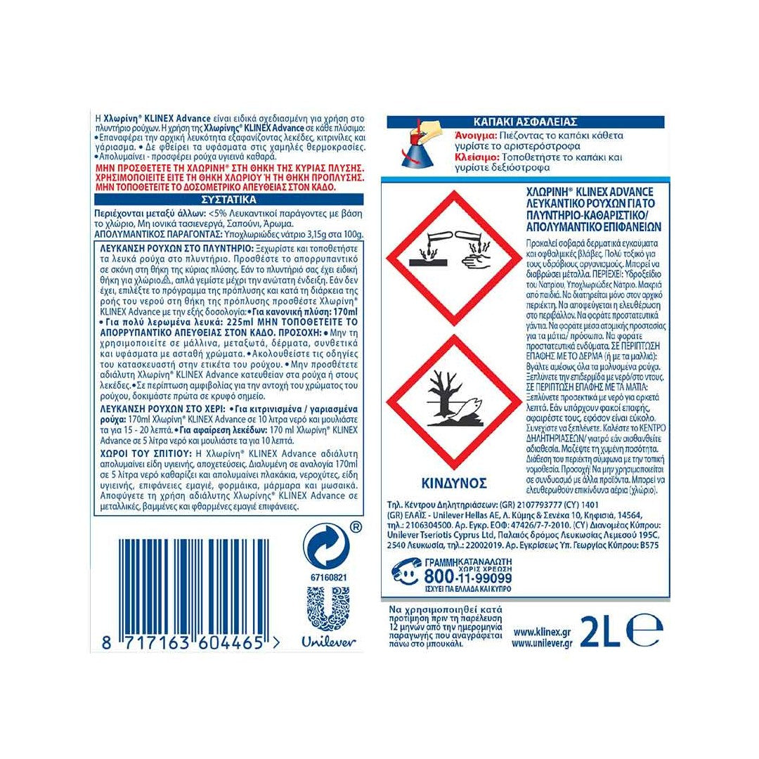ΠεριγραφήH Χλωρίνη® Klinex Advance με ειδικά σχεδιασμένη σύνθεση επαναφέρει την αρχική λευκότητα των ρούχων, ενώ είναι η μόνη εξειδικευμένη Χλωρίνη για χρήση στο πλυντήριο ρούχων. Χρησιμοποιείστε τη σε κάθε πλύση με λευκά, εξαφανίστε λεκέδες, κιτρινίλες και γάργιασμα. Η Χλωρίνη Klinex Advance δε φθείρει τα υφάσματα στις χαμηλές θερμοκρασίες, ενώ εξουδετερώνει το 99,9% των μικροβίων χαρίζοντας υγιεινή καθαριότητα στα ρούχα όλης της οικογένειας! * Βάσει εργαστηριακών τεστ ΕΝ. **Χρησιμοποιείτε τα βιοκτόνα προϊόντα με ασφαλή τρόπο. Διαβάζετε πάντοτε την ετικέτα και τις πληροφορίες σχετικά με το προϊόν πριν από τη χρήση.