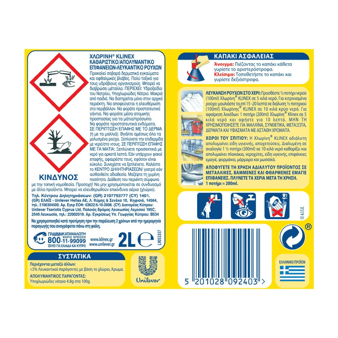 ΠεριγραφήΚαθαρίζει - Λευκαίνει - Απολυμαίνει. Η Λεπτόρρευστη Χλωρίνη® KLINEX Λεμόνι είναι το ασφαλέστερο απολυμαντικό για γενική καθαριότητα και απολύμανση σε όλο το σπίτι.