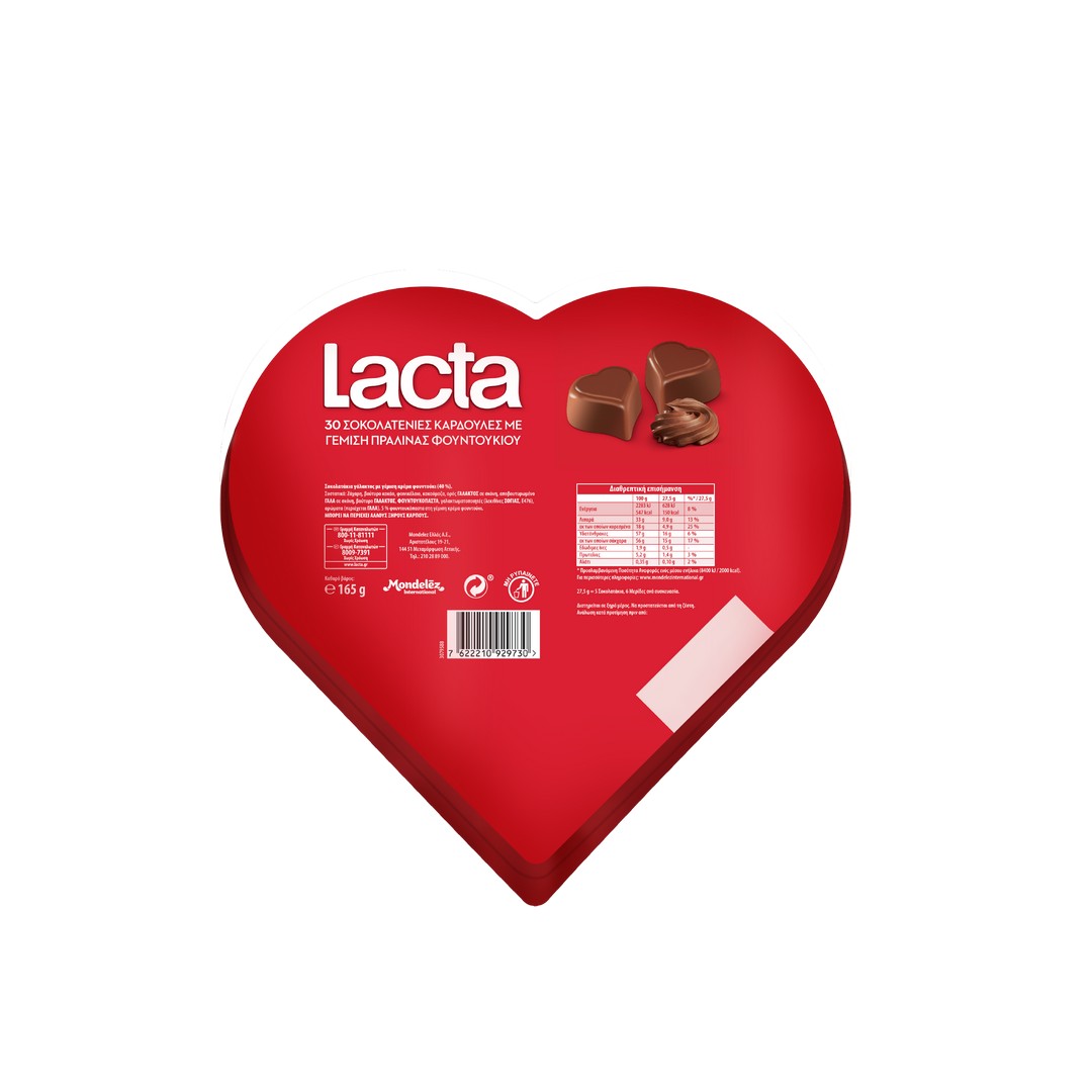 ΠεριγραφήΧάρισε μία μικρή δόση αγάπης προσφέροντας δώρο τις σοκολατένιες καρδούλες Lacta με γέμιση πλούσιας βελούδινης πραλίνας φουντουκιού.