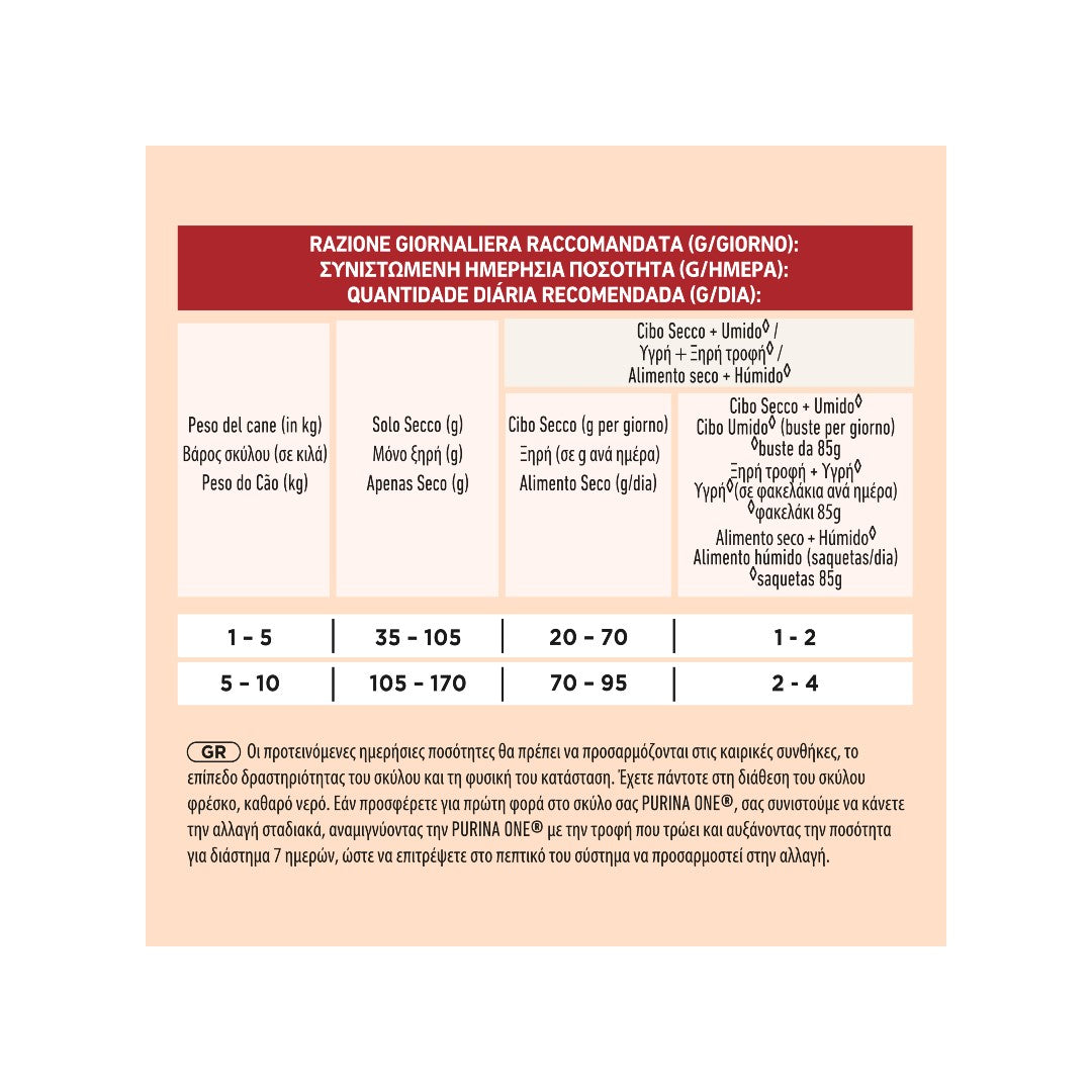 Αντιοξειδωτικά.Οδηγίες Χρήσης/ΑποθήκευσηςΕάν προσφέρετε για πρώτη φορά στο σκύλο σας Purina ONE, σας συνιστούμε να κάνετε την αλλαγή σταδιακά, αναμιγνύοντας την Purina ONE με την τροφή που τρώει και αυξάνοντας την ποσότητα για διάστημα 7 ημερών, ώστε να επιτρέψετε στο πεπτικό του σύστημα να προσαρμοστεί στην αλλαγή.